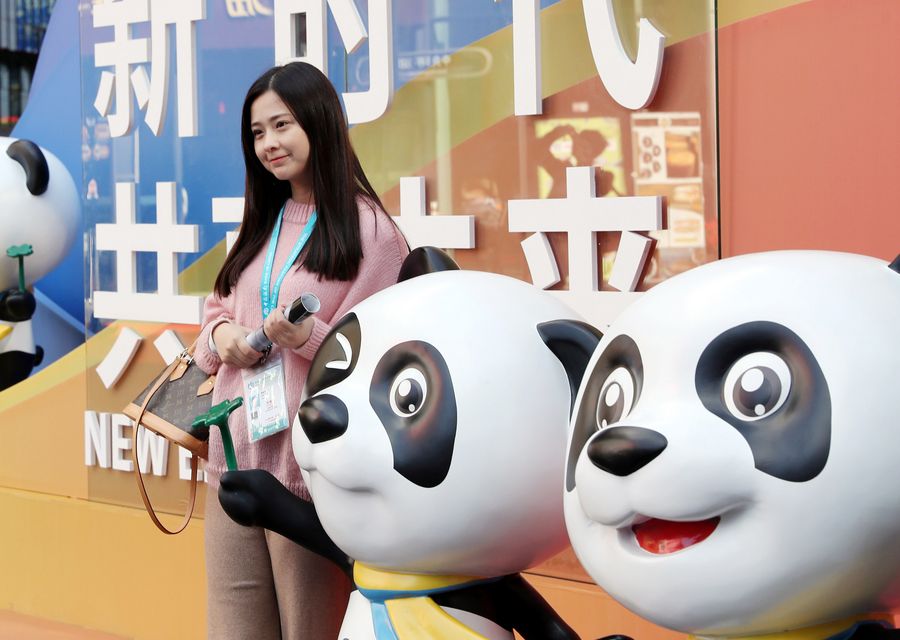 A visitor poses for photos with Jinbao, mascot of the China International Import Expo (CIIE), during the second CIIE in Shanghai, east China, Nov. 8, 2019. (Xinhua/Liu Ying)