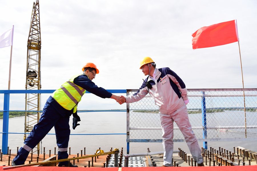 Workers from China and Russia shake hands after the two ends of the Blagoveshchensk-Heihe highway bridge were joined together on May 31, 2019. (Xinhua/Wang Jian)