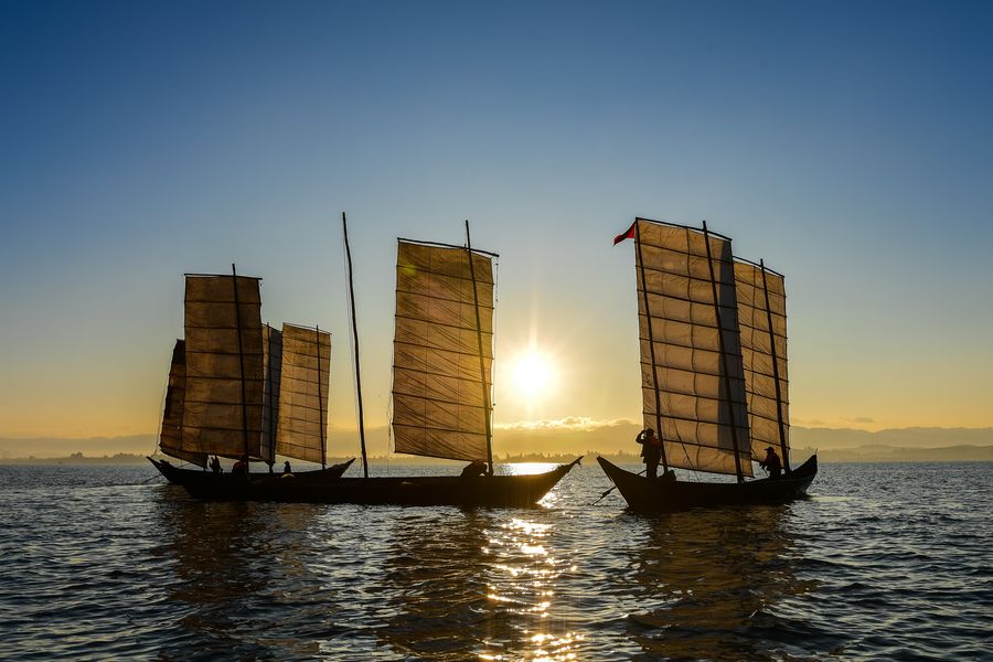 Fishing boats sail on Dianchi Lake in Kunming, southwest China's Yunnan Province, Oct. 23, 2019. (Xinhua/Hu Chao)