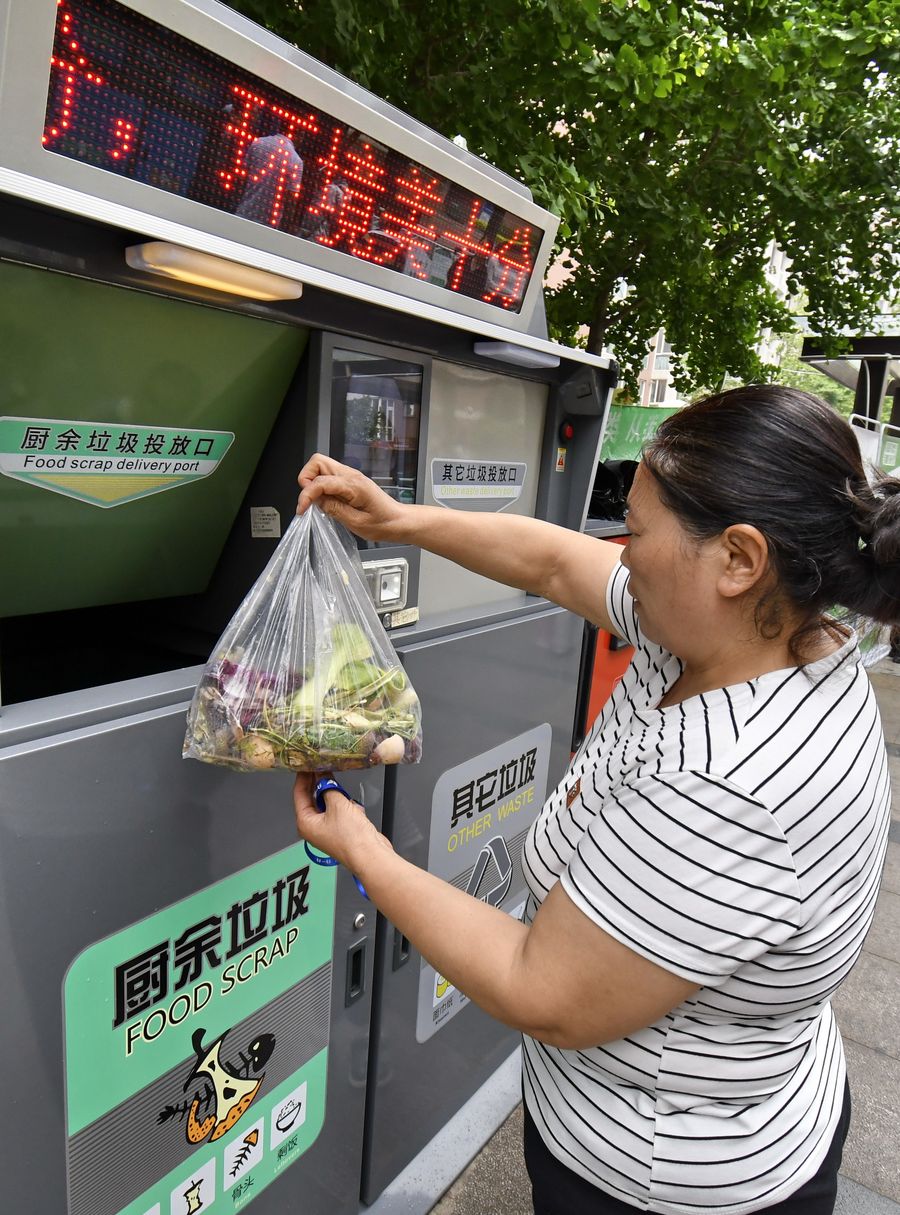 One resident threw kitchen waste into a smart trash can in Dongcheng District of Beijing on June 6, 2019. (Xinhua/Li Xin)