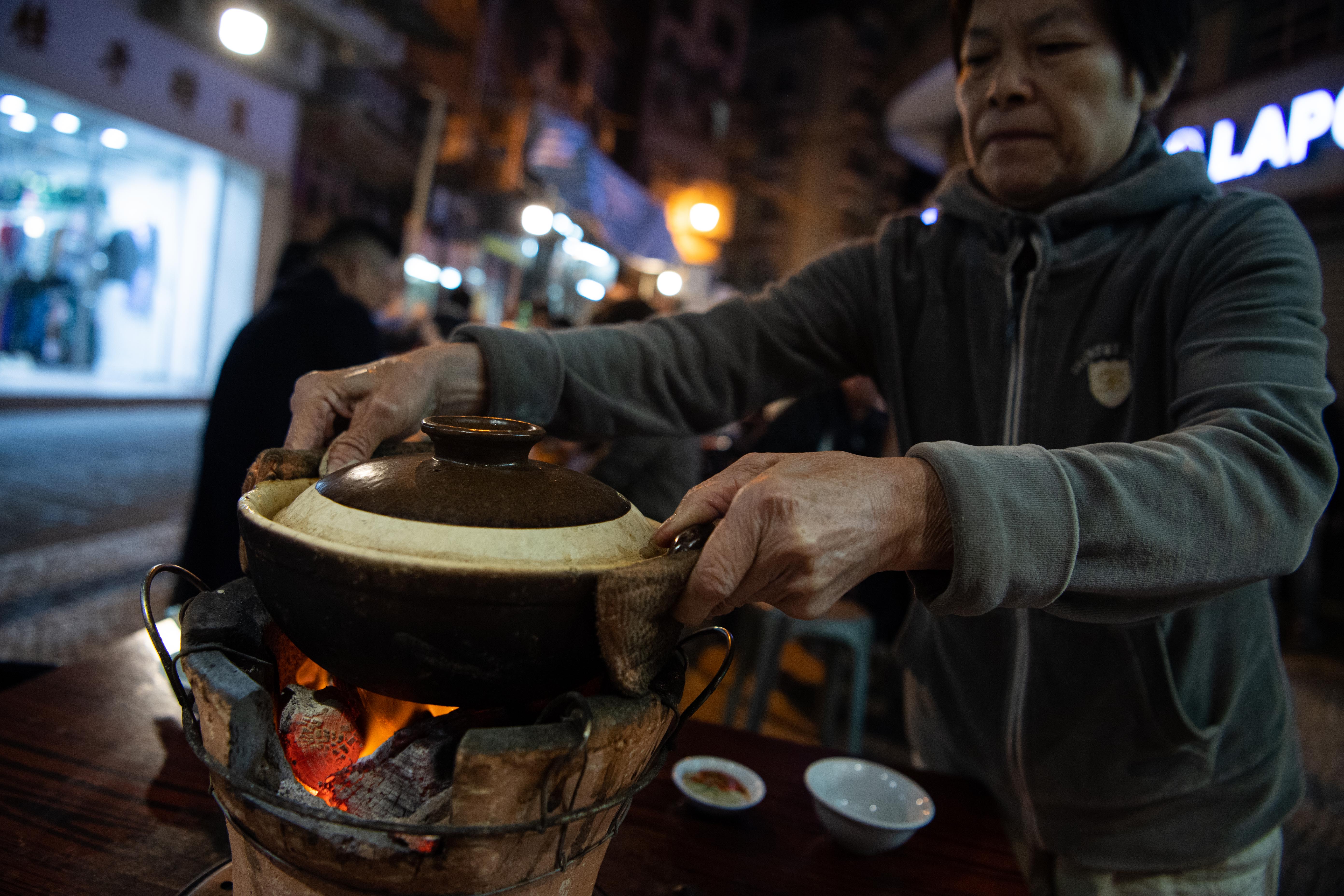 Staff of a snack shop serves stewed lamb pot at Avenida de Almeida Ribeiro in south China's Macao, Dec. 3, 2019.(Xinhua/Cheong Kam Ka)