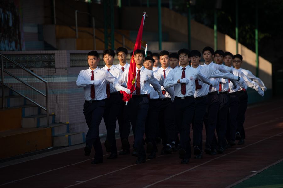 A flag-raising ceremony is held at the Hou Kong Middle School in Macao, south China, Nov. 18, 2019. (Xinhua/Cheong Kam Ka)
