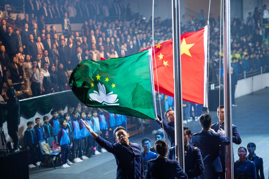 Students attend a flag-raising ceremony during a gala performance celebrating 20th anniversary of Macao's return to motherland in south China's Macao, Dec. 6, 2019. (Xinhua/Cheong Kam Ka)
