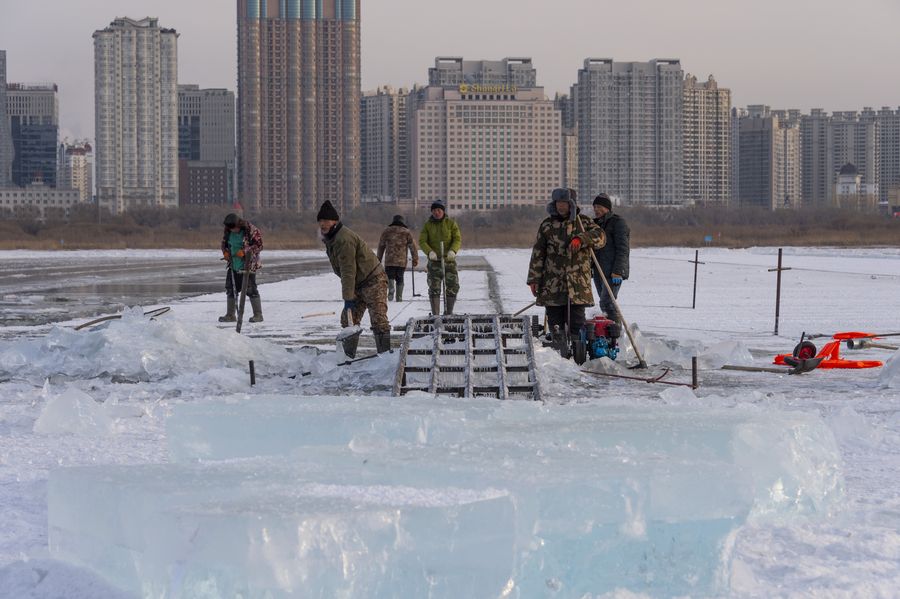 Workers collect ice from the Songhua River in Harbin, capital of northeast China's Heilongjiang Province, Dec. 11, 2019. Ice cubes collected from the frozen Songhua River will be used in decoration of the city. (Photo by Xie Jianfei/Xinhua)