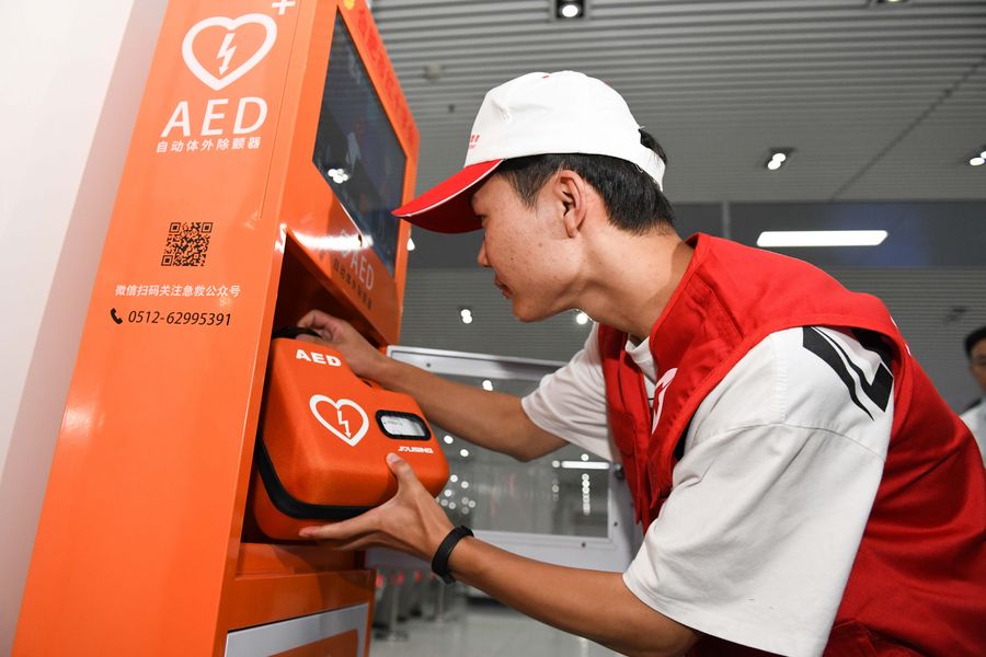 An automated external defibrillator (AED) device is put into use at the subway station of Hefei South Railway Station on Hefei Rail Transit Line 1 in Hefei, capital of east China's Anhui Province, Sept. 14, 2019. (Xinhua/Zhang Duan)