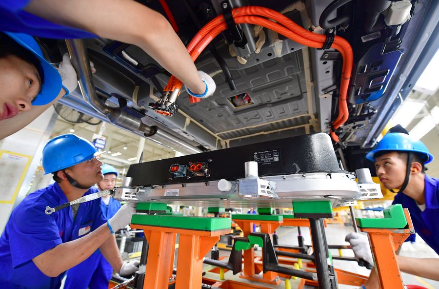 Assembly workers install the battery pack for a new energy vehicle at Xi'an plant of BYD Auto in Xi'an, northwest China's Shaanxi Province, June 12, 2019.(Xinhua/Shao Rui)