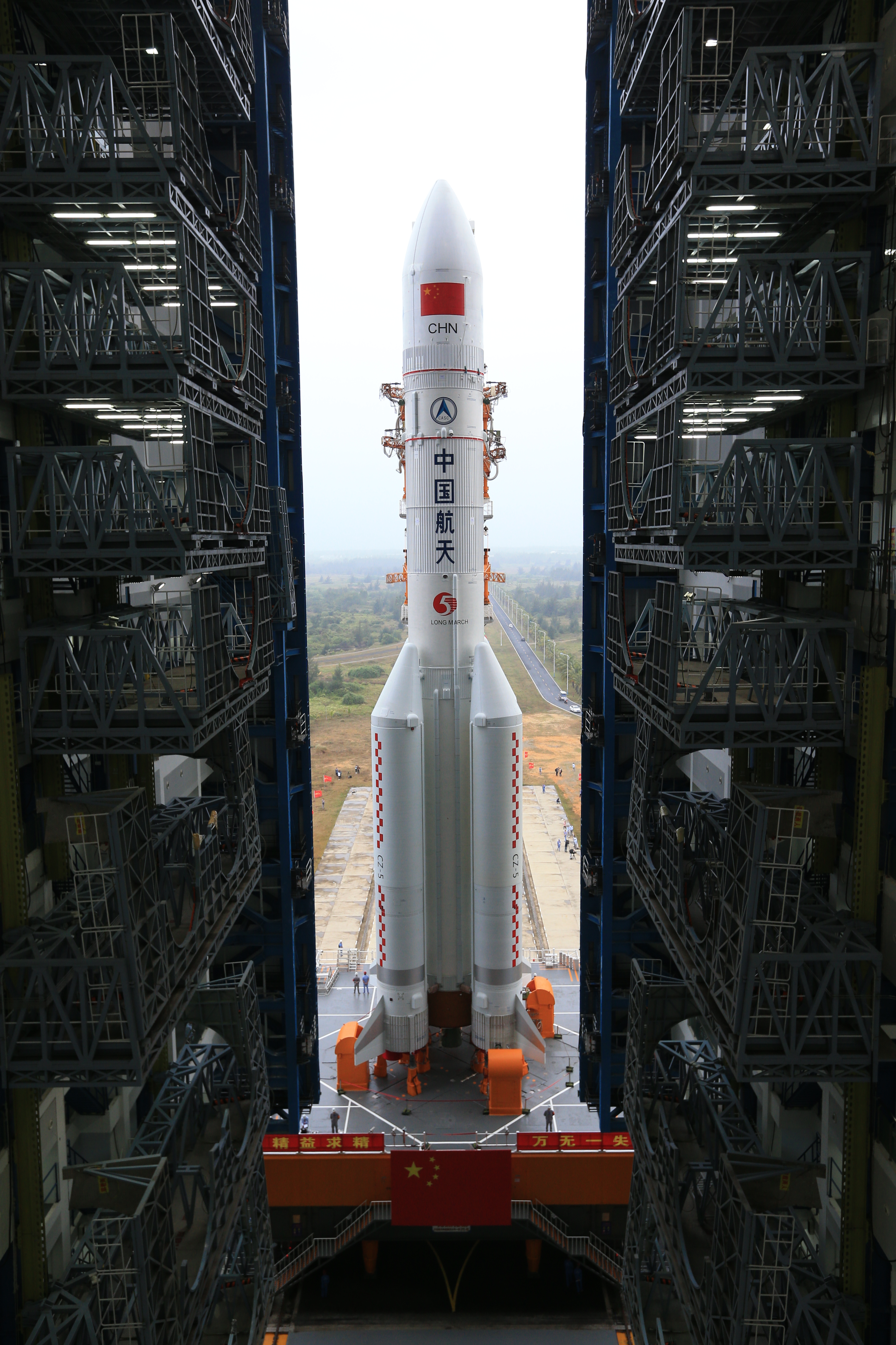 Carrier rocket Long March-5 Y3 is being vertically transported to the launching area of Wenchang Space Launch Center in south China's Hainan Province, Dec. 21, 2019. (Photo by Guo Wenbin/Xinhua)