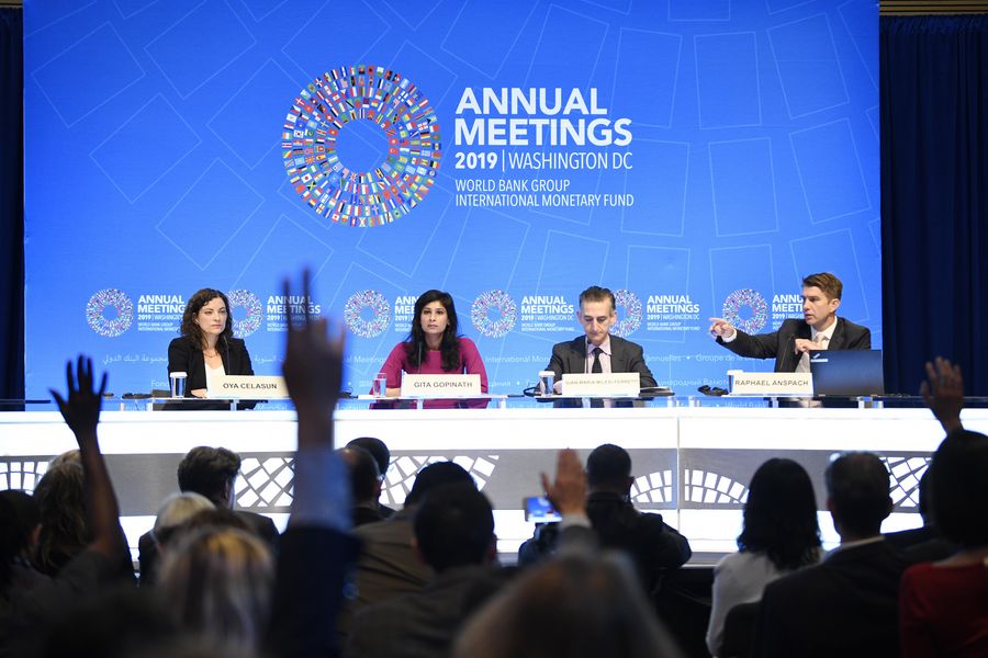 International Monetary Fund (IMF) chief economist Gita Gopinath (2nd L) attends a press conference in Washington D.C., the United States, on Oct. 15, 2019. (Xinhua/Liu Jie)