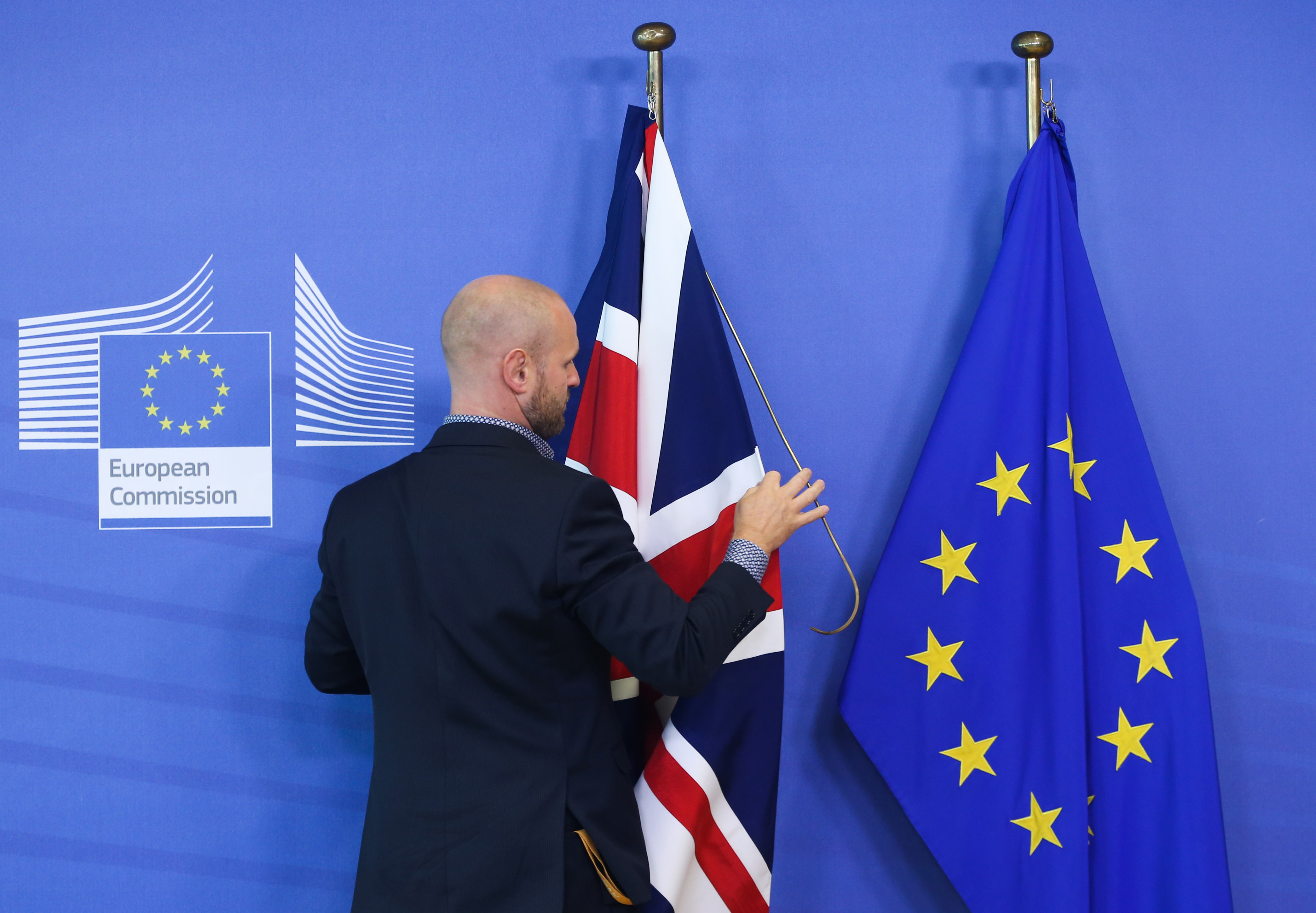 A staff member arranges flags of the UK and the EU before the meeting between President of the European Commission Jean-Claude Juncker and British Prime Minister Boris Johnson at the European Commission headquarters in Brussels, Belgium, Oct. 17, 2019. (Xinhua/Zheng Huansong)