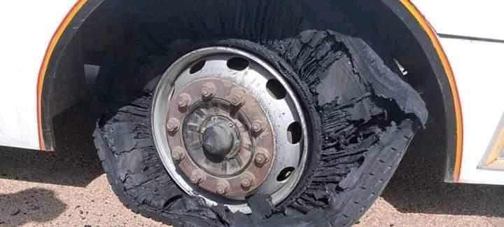 The right front wheel of a bus was damaged by the bullets which landing on both sides of the bus body in the coastal county of Lamu, Kenya, on Jan. 2, 2019. (Xinhua/Chris Mgidu)