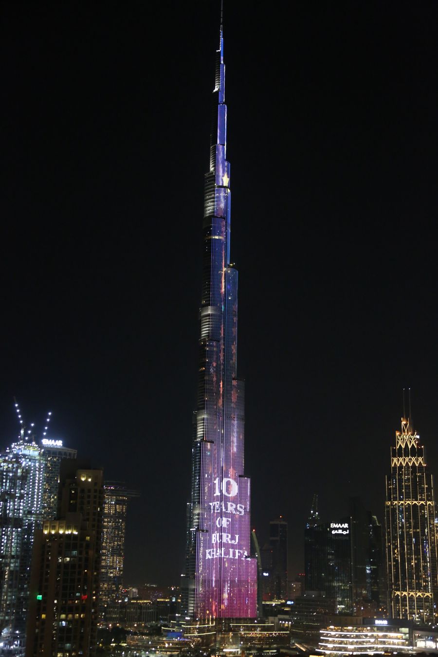 Photo taken on Jan. 4, 2020 shows the light show at Burj Khalifa in Downtown Dubai, the United Arab Emirates (UAE). Burj Khalifa, the tallest building in the world, celebrated its 10th anniversary with special LED light shows on Saturday in Dubai. The building officially opened on Jan. 4, 2010. (Xinhua/Su Xiaopo)