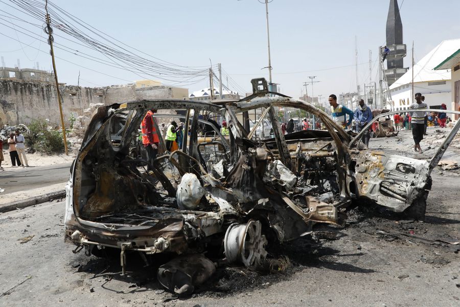 Photo taken on Jan. 8, 2020 shows the car bomb explosion site in Mogadishu, capital of Somalia. At least two people were killed and more than ten others injured after a massive car bomb exploded at a busy checkpoint in Somali capital Mogadishu on Wednesday, witnesses said. (Photo by Hassan Bashi/Xinhua)