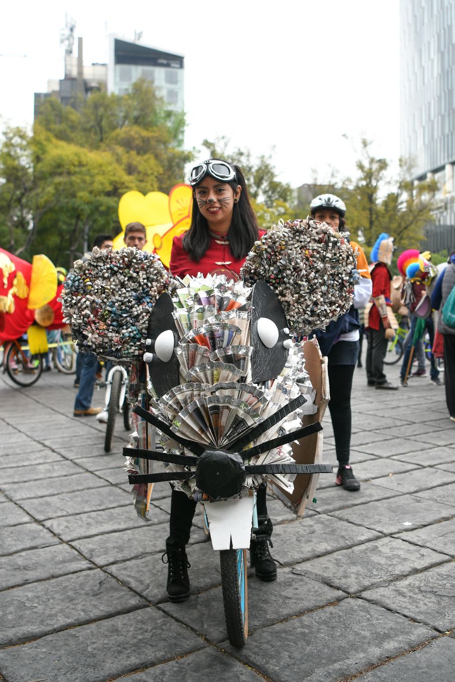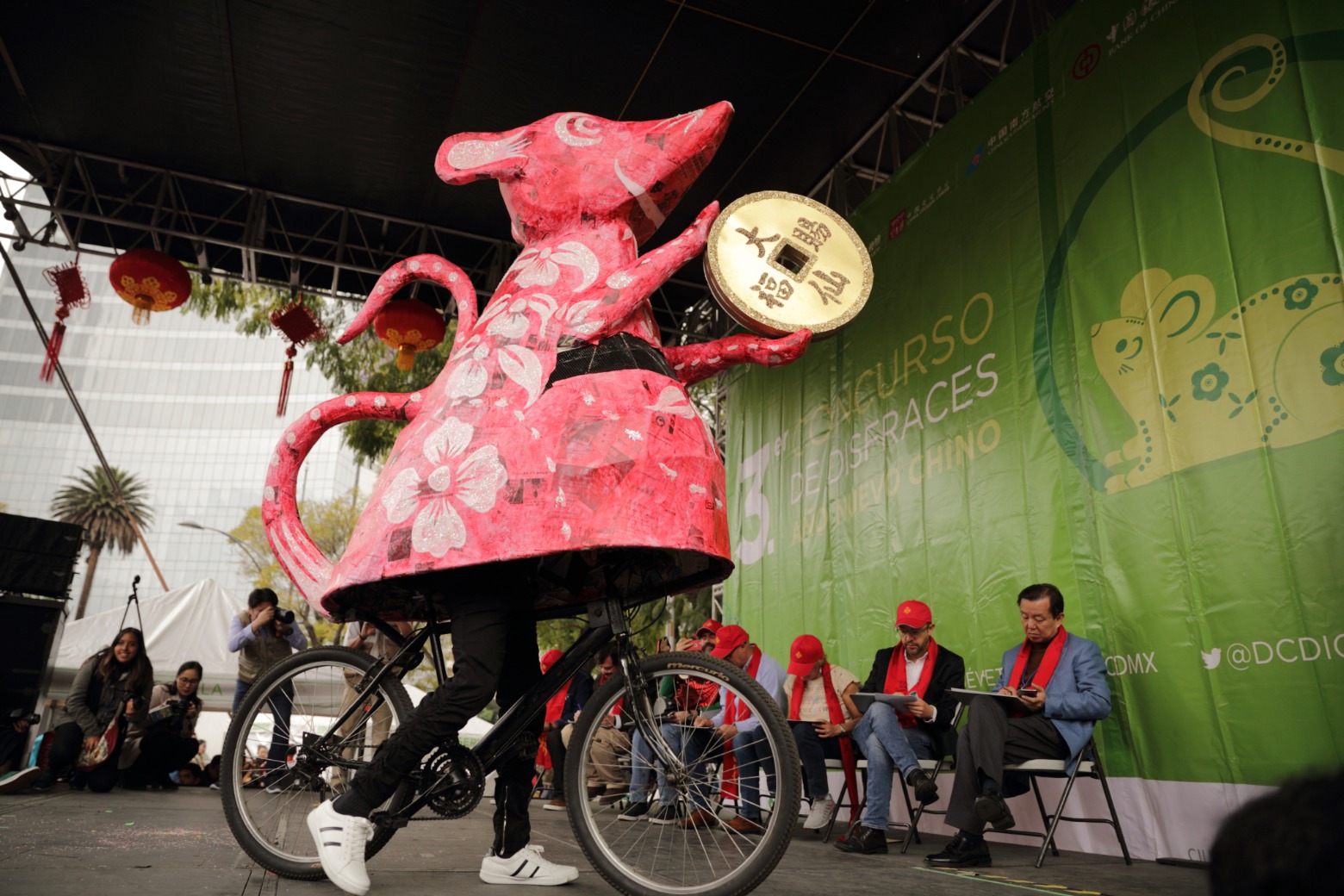 A person in costume of rat participates in a bicycle zodiac decoration competition in Mexico City, Mexico, Jan. 19, 2020. (Photo provided by China Cultural Center in Mexico)