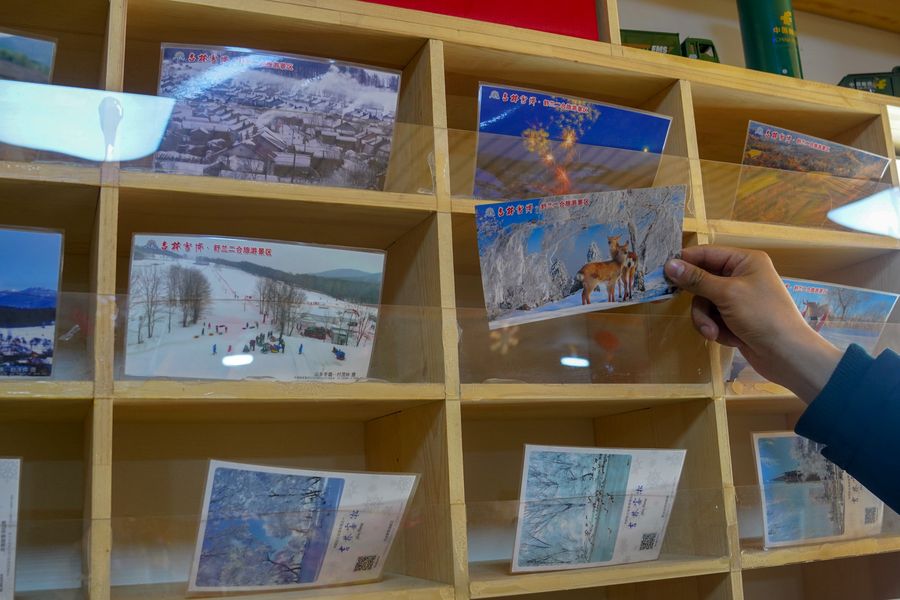 A tourist picks postcards at a snow-themed post office in Ma'anling Village of Shulan City, northeast China's Jilin Province, Jan. 21, 2020. (Xinhua/Zhang Nan)