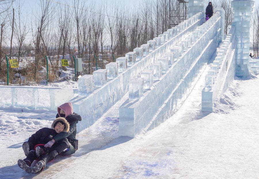 Children play ice-slide in Sihe Village of Shulan City, northeast China's Jilin Province, Jan. 21, 2020. (Xinhua/Zhang Nan)