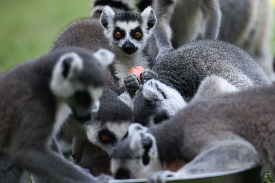 Ring-tailed lemurs eat fruits at the Hefei Wildlife Park in Hefei, east China's Anhui Province. (Xinhua/Zhang Duan)