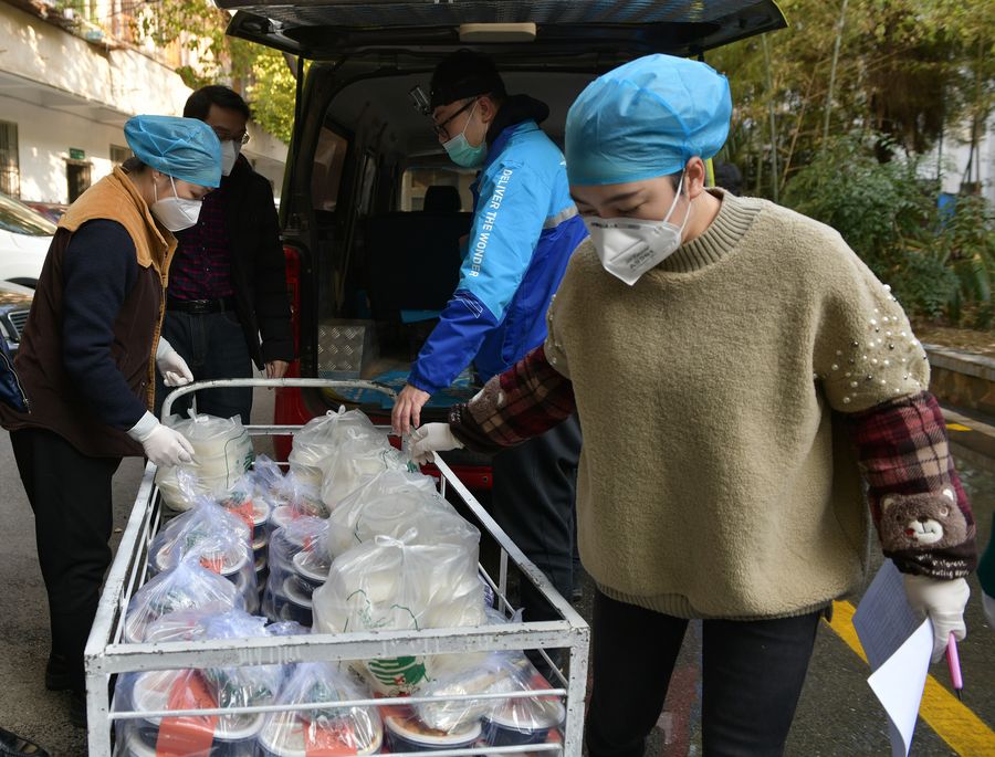 Staff members receive takeaways from a deliveryman at a hospital in Wuhan, central China's Hubei Province, Jan. 31, 2020. (Xinhua/Li He)