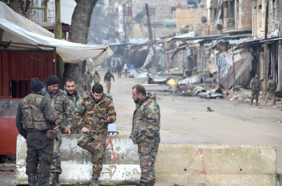 Syrian soldiers are seen standing in the street in the Maarat al-Numan city, Idlib Province, Syria, on Jan. 30, 2020. (Photo by Maher/Xinhua)