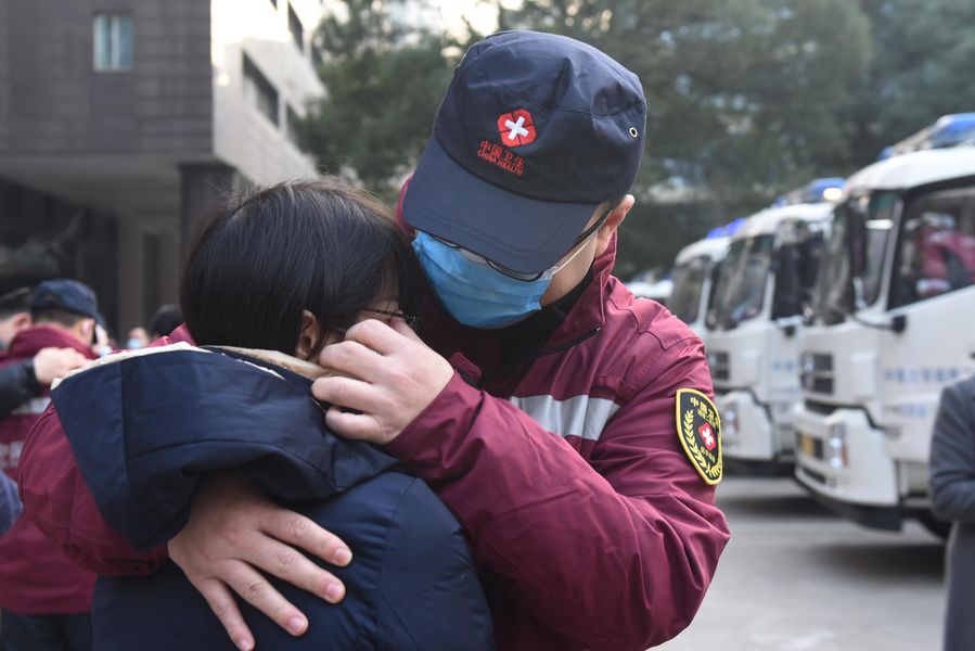 Zhang Lei (R), a doctor of nephrology department of the Second Xiangya Hospital of Central South University, hugs his wife before setting out for Hubei Province in Changsha, central China's Hunan Province, Feb. 4, 2020. A medical team comprised of 42 members from the Second Xiangya Hospital of Central South University set off on Tuesday to aid the coronavirus control efforts in Hubei. (Xinhua)