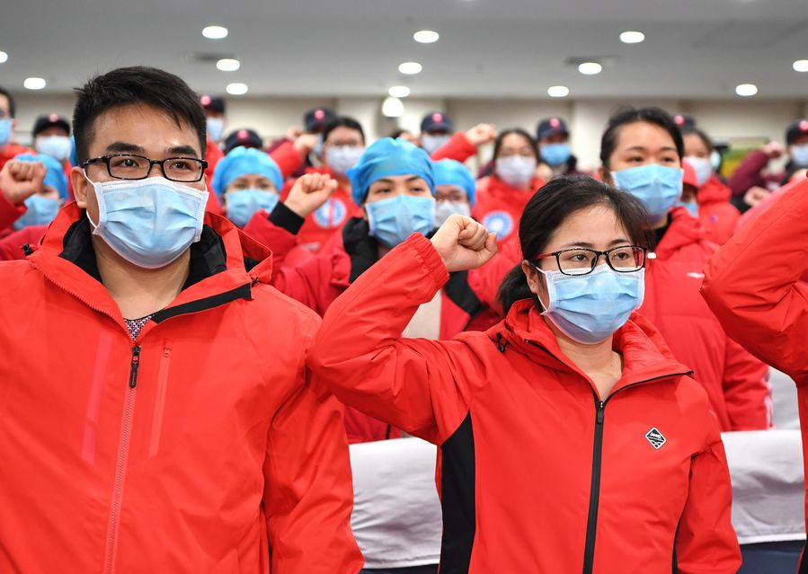 Medical team members take an oath before setting out for Hubei Province, in Nanning, south China's Guangxi Zhuang Autonomous Region, Feb. 4, 2020. The second batch of medical teams of 136 members from Guangxi set off on Tuesday to aid the coronavirus control efforts in Hubei. (Xinhua/Zhou Hua)