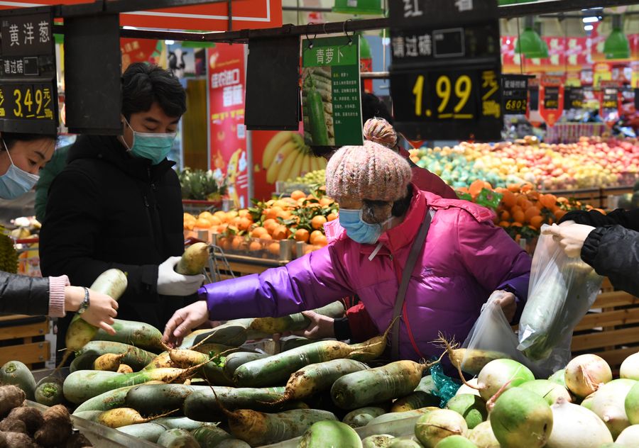 People buy vegetables in a supermarket in Qingdao, east China's Shandong Province, Jan. 29, 2020. (Xinhua/Li Ziheng)