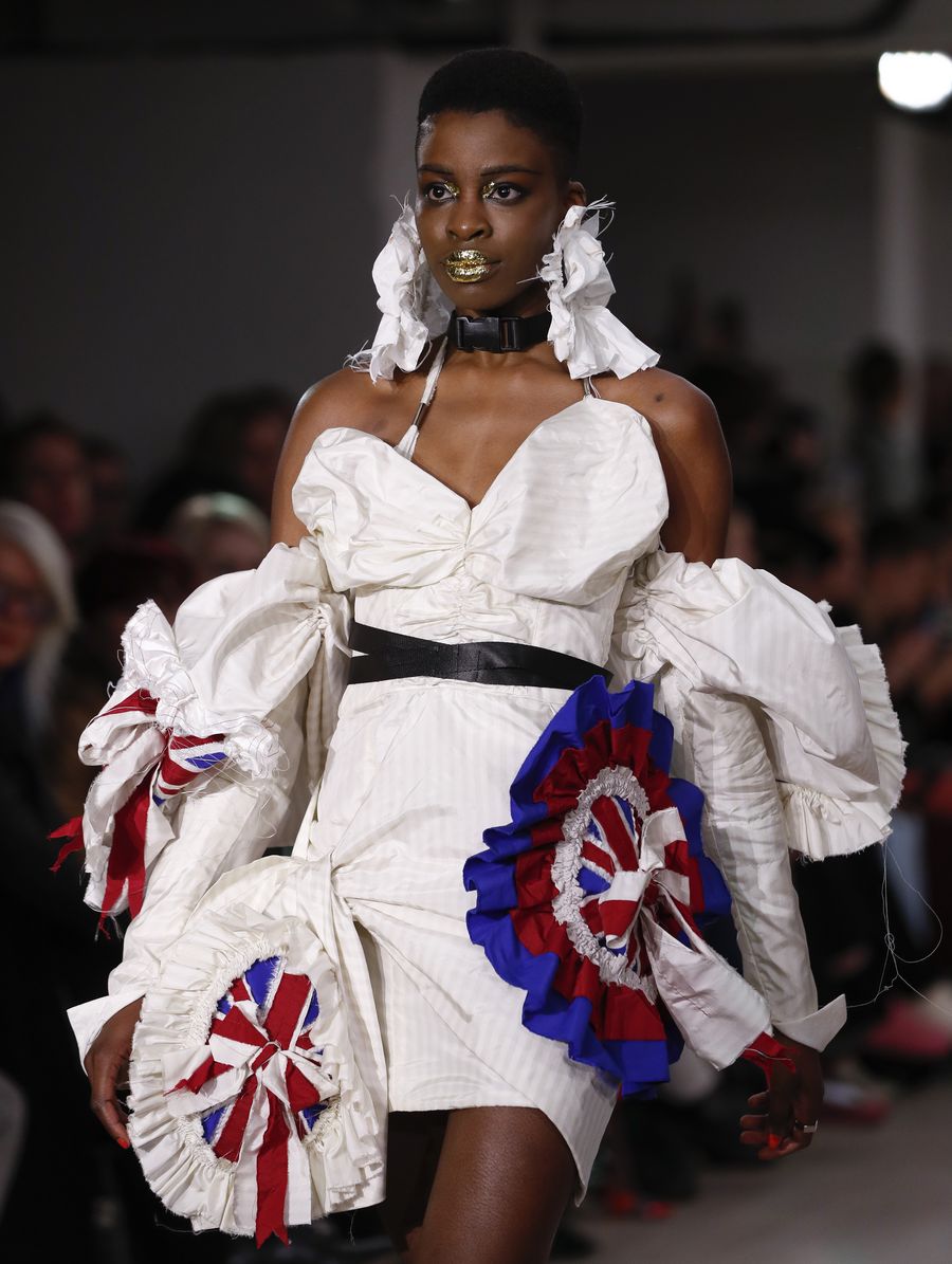 A model walks the runway at Petar Petrov catwalk show during the London Fashion Week at the Royal Institute of British Architects in London, Britain. (Xinhua/Han Yan)
