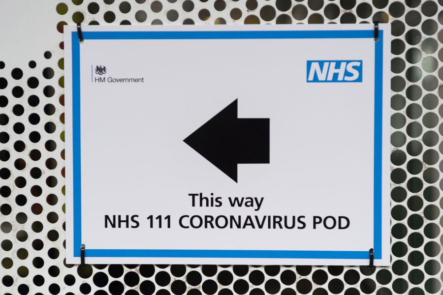 Photo taken on March 2, 2020 shows a sign directing patients to a National Health Service (NHS) 111 Coronavirus Pod positioned at the University College Hospital in London, Britain. (Photo by Ray Tang/Xinhua)