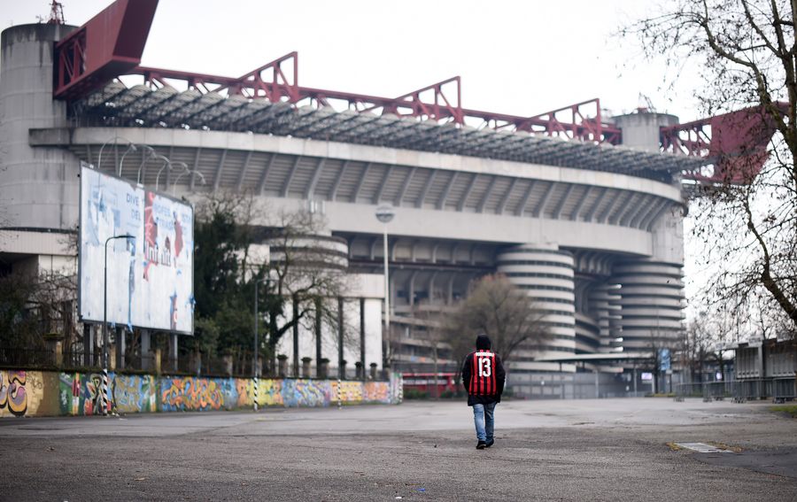 A fan of AC Milan walks outside the San Siro stadium after a Serie A soccer match between AC Milan and Genoa was postponed due to the recent coronavirus outbreak in Milan, Italy, March 1, 2020.(Photo by Alberto Lingria/Xinhua)