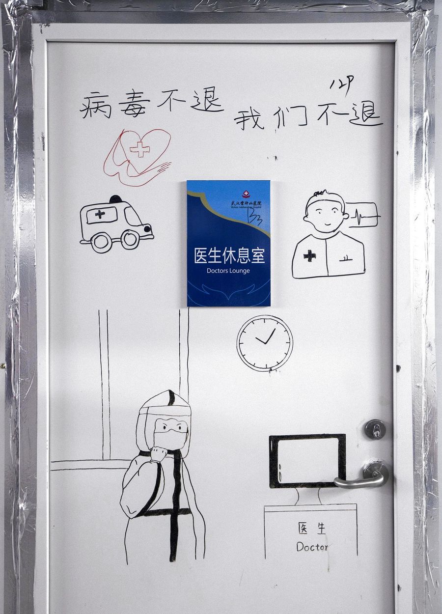 Photo taken on March 4, 2020 shows a cartoon on a door in a corridor at the Leishenshan (Thunder God Mountain) Hospital in Wuhan, central China's Hubei Province. (Xinhua/Fei Maohua)■