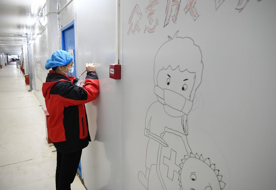 Xu Xinyan, a worker from China Construction Third Engineering Bureau Co., Ltd., draws on the wall of a corridor at the Leishenshan (Thunder God Mountain) Hospital in Wuhan, central China's Hubei Province, March 4, 2020. (Xinhua/Fei Maohua)