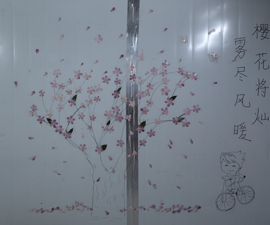 Photo taken on March 4, 2020 shows a collage on the wall of a corridor at the Leishenshan (Thunder God Mountain) Hospital in Wuhan, central China's Hubei Province. It depicts a cherry blossom tree in full bloom in the spring. (Xinhua/Fei Maohua)