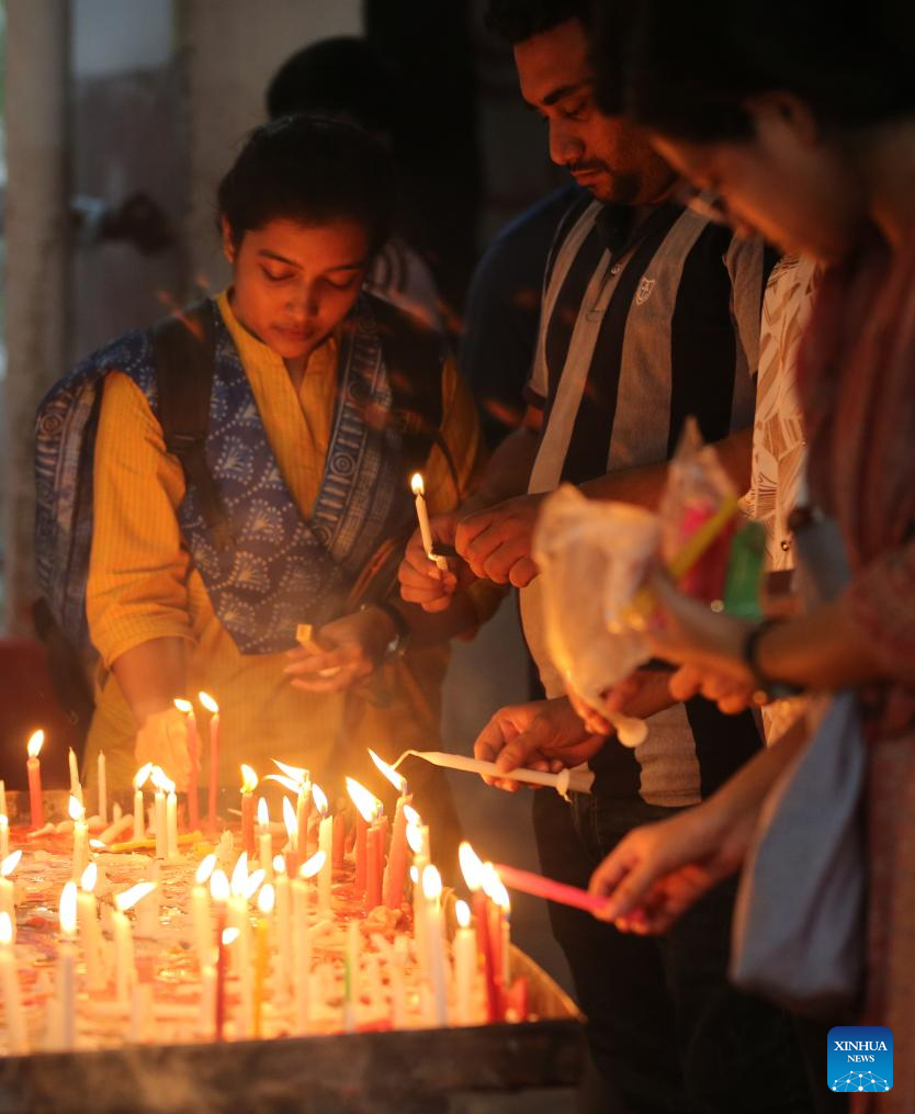 People light candles to celebrate Diwali, or the Hindu festival of lights, at a temple in Dhaka, Bangladesh on Oct. 20, 2025. (Photo by Habibur Rahman/Xinhua)
