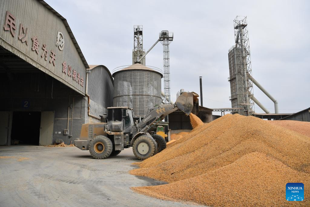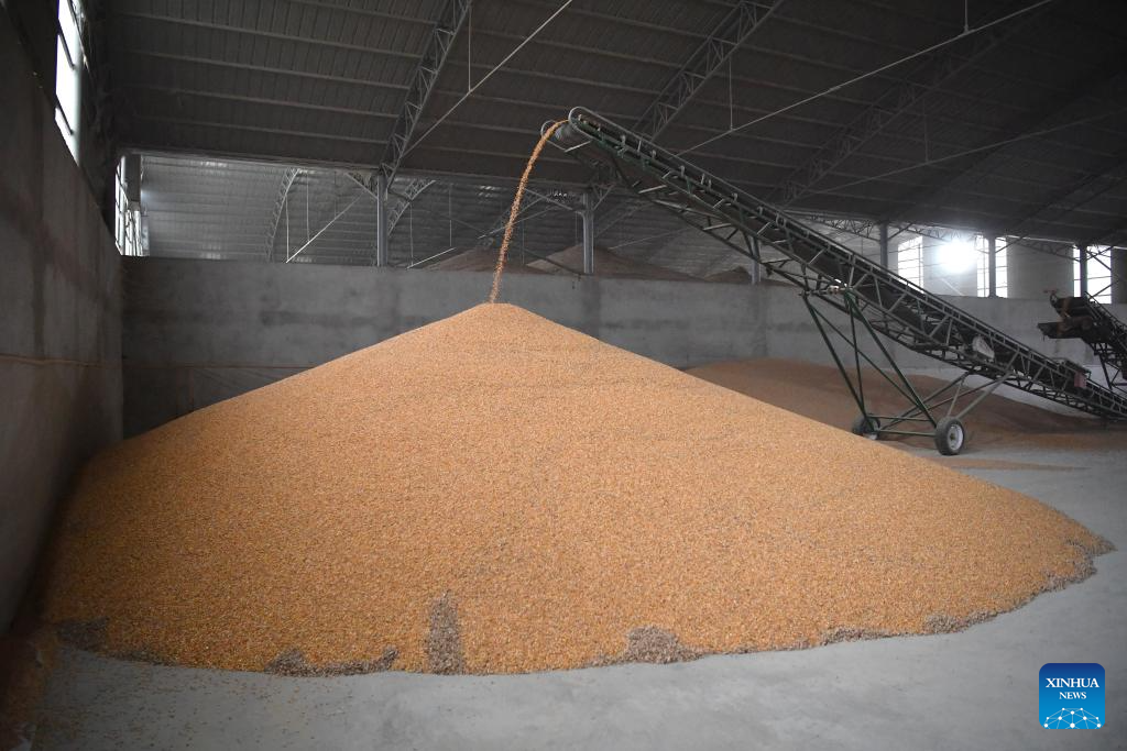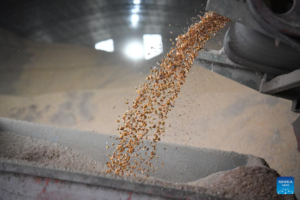 This photo taken on Oct. 20, 2025 shows the grains put into storage after being dried at an autumn grain purchasing and drying station in Sanxing Village of Xinyang Town, Qianxian County in northwest China's Shaanxi Province. In order to cope with the continuous rainy weather at the current critical period for autumn grain harvest, Shaanxi Province has dispatched crawler harvesters, mobile grain dryers, color sorters and other machinery to improve the harvesting efficiency. By far, the province has established 476 emergency operation teams and 765 grain drying stations, with a daily drying capacity of over 70,000 tonnes, providing a solid guarantee for the harvesting work. (Xinhua/Shao Rui)