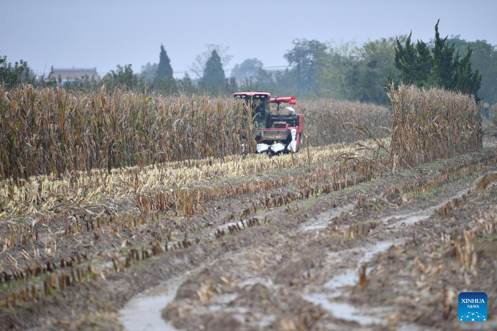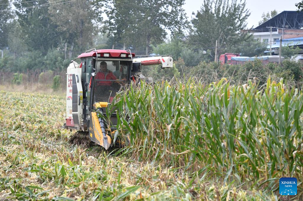 A crawler reaper harvests corn in Shangguan Village of Wangcun Town, Qianxian County in northwest China's Shaanxi Province, on Oct. 20, 2025. In order to cope with the continuous rainy weather at the current critical period for autumn grain harvest, Shaanxi Province has dispatched crawler harvesters, mobile grain dryers, color sorters and other machinery to improve the harvesting efficiency. By far, the province has established 476 emergency operation teams and 765 grain drying stations, with a daily drying capacity of over 70,000 tonnes, providing a solid guarantee for the harvesting work. (Xinhua/Shao Rui)