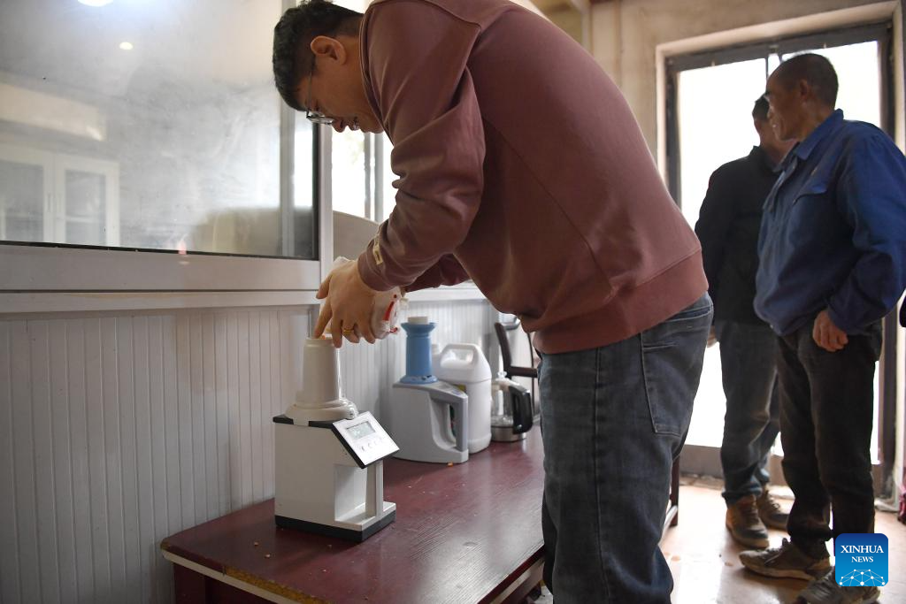 A staff member measures the moisture content of grain samples at an autumn grain purchasing and drying station in Dengqiao Village of Dacheng Town, Sanyuan County in northwest China's Shaanxi Province, on Oct. 21, 2025. In order to cope with the continuous rainy weather at the current critical period for autumn grain harvest, Shaanxi Province has dispatched crawler harvesters, mobile grain dryers, color sorters and other machinery to improve the harvesting efficiency. By far, the province has established 476 emergency operation teams and 765 grain drying stations, with a daily drying capacity of over 70,000 tonnes, providing a solid guarantee for the harvesting work. (Xinhua/Shao Rui)
