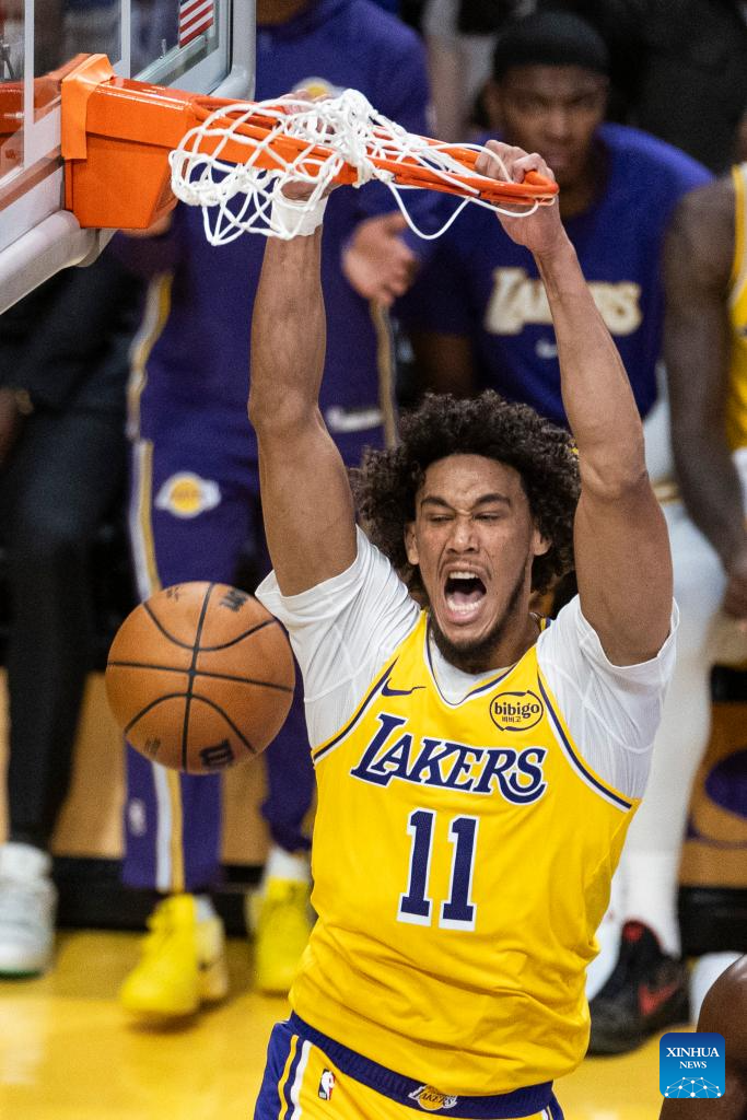 Los Angeles Lakers' Jaxson Hayes dunks during the 2025-2026 NBA regular season match between Los Angeles Lakers and Golden State Warriors in Los Angeles, the United States, Oct. 21, 2025. (Photo by Ringo Chiu/Xinhua)