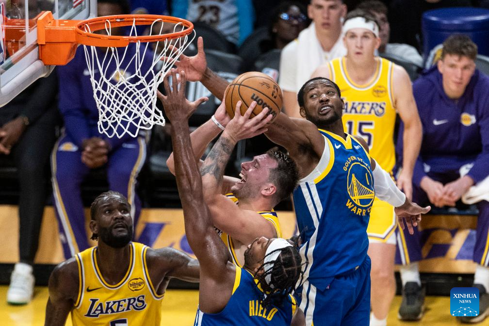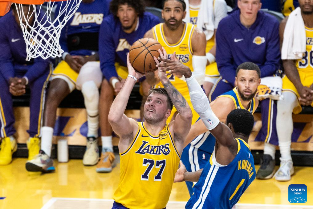 Los Angeles Lakers' Luka Doncic (L) fights against Golden State Warriors' Jonathan Kuminga (R) and Stephen Curry during the 2025-2026 NBA regular season match between Los Angeles Lakers and Golden State Warriors in Los Angeles, the United States, Oct. 21, 2025. (Photo by Ringo Chiu/Xinhua)