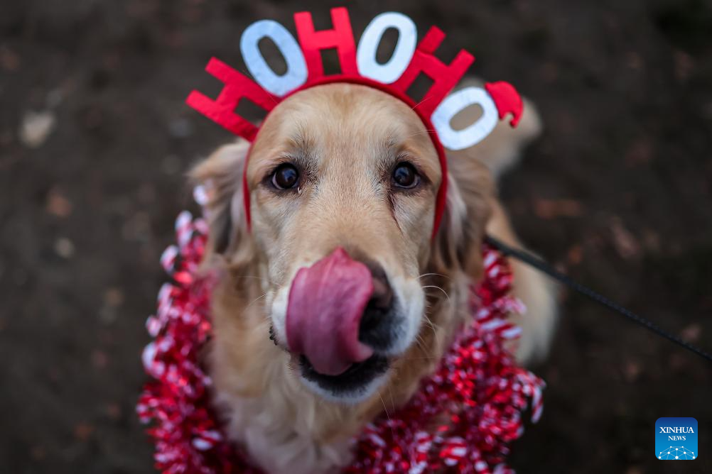 A dog participates in an annual "Santa Dog Walk" event in the City Park in Budapest, Hungary on Dec. 6, 2025. The Christmas-themed event brings together dog owners from across the city for a seasonal walk, promoting responsible pet ownership and encouraging outdoor activities for families and their pets. (Photo by David Balogh/Xinhua)