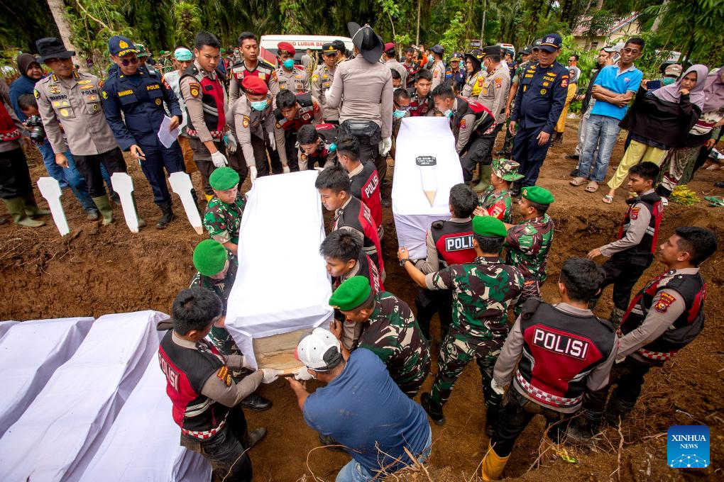 Police officers lay coffins during a mass burial for victims of floods and landslides in Agam regency, West Sumatra, Indonesia, Dec. 11, 2025. The death toll from floods and landslides that struck three provinces on Indonesia's Sumatra Island has exceeded 1,000, with 218 people still missing, according to the latest data released Saturday by the National Disaster Management Agency (BNPB). (Photo by Andri Mardiansyah/Xinhua)