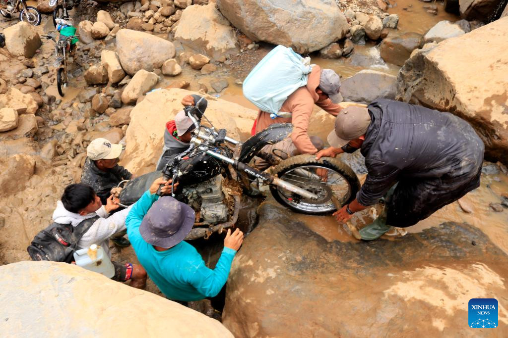 Villagers move a motorcycle across a river after floods and landslides hit Bener Meriah regency in Aceh, Indonesia, Dec. 9, 2025. The death toll from floods and landslides that struck three provinces on Indonesia's Sumatra Island has exceeded 1,000, with 218 people still missing, according to the latest data released Saturday by the National Disaster Management Agency (BNPB). (Photo by Yulham/Xinhua)
