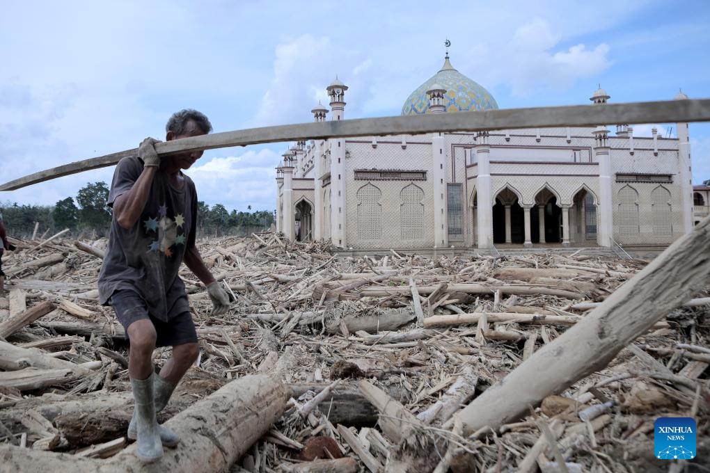 A villager moves timber amid debris after floods and landslides hit Aceh Tamiang regency in Aceh, Indonesia, Dec.10, 2025. The death toll from floods and landslides that struck three provinces on Indonesia's Sumatra Island has exceeded 1,000, with 218 people still missing, according to the latest data released Saturday by the National Disaster Management Agency (BNPB). (Photo by Gatha Ginting/Xinhua)