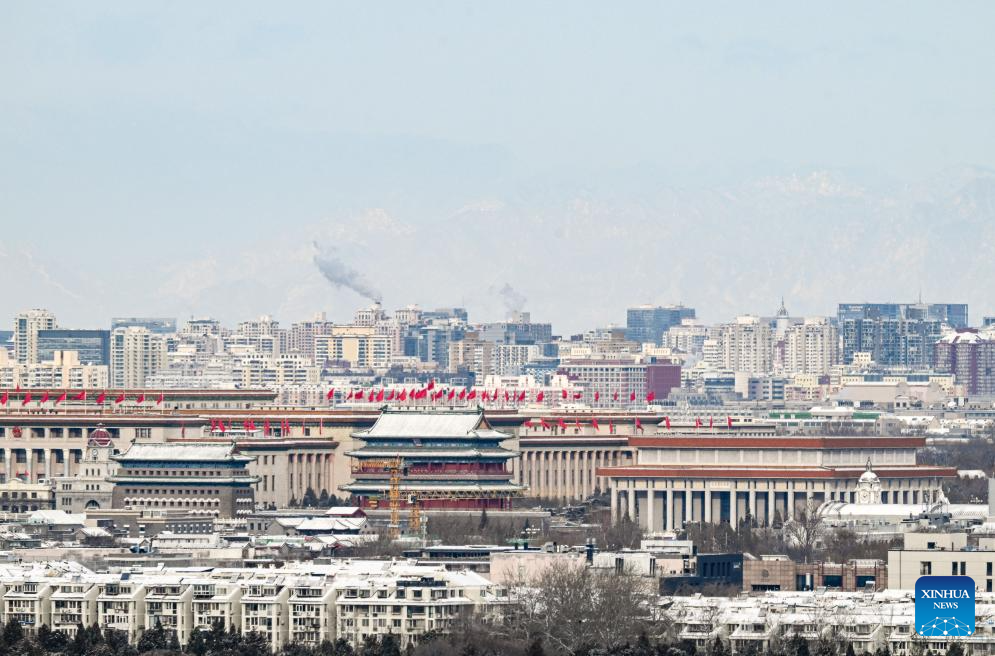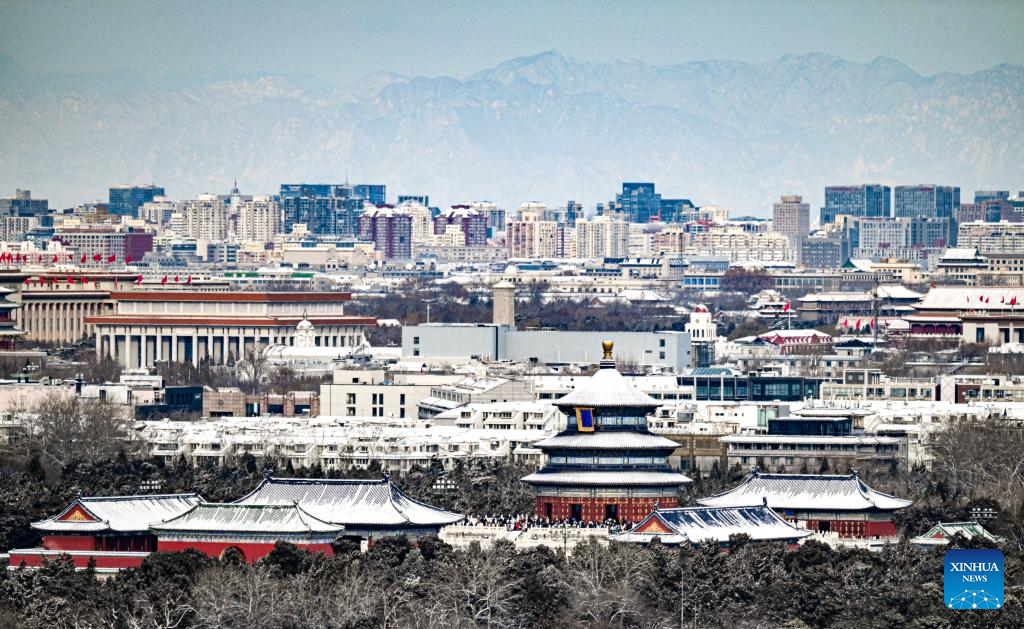 This photo taken on Dec. 13, 2025 shows a snow scenery against the skyline in Beijing, capital of China. Beijing witnessed its first significant snowfall of this winter season on Friday. (Xinhua/Chen Yehua)