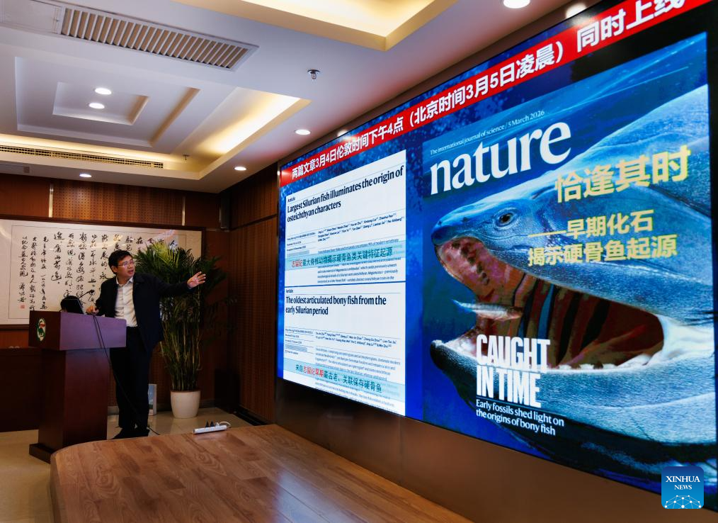 Zhu Min, an academician of Chinese Academy of Sciences (CAS) from the Institute of Vertebrate Paleontology and Paleoanthropology (IVPP) of the CAS, speaks during a press conference at the IVPP, in Beijing, capital of China, March 3, 2026. Fossils of two fish from over 400 million years ago -- one a tiny streamlined creature, the other a giant among vertebrates of its time with bizarre teeth -- have been discovered in China, filling a critical gap in the evolutionary journey "from fish to human." (Xinhua/Jin Liwang)