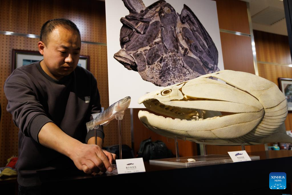 A staff member places models of restored Eosteus chongqingensis (L) and Megamastax amblyodus at the Institute of Vertebrate Paleontology and Paleoanthropology (IVPP) of the Chinese Academy of Sciences (CAS), in Beijing, capital of China, March 3, 2026. Fossils of two fish from over 400 million years ago -- one a tiny streamlined creature, the other a giant among vertebrates of its time with bizarre teeth -- have been discovered in China, filling a critical gap in the evolutionary journey "from fish to human." (Xinhua/Jin Liwang)