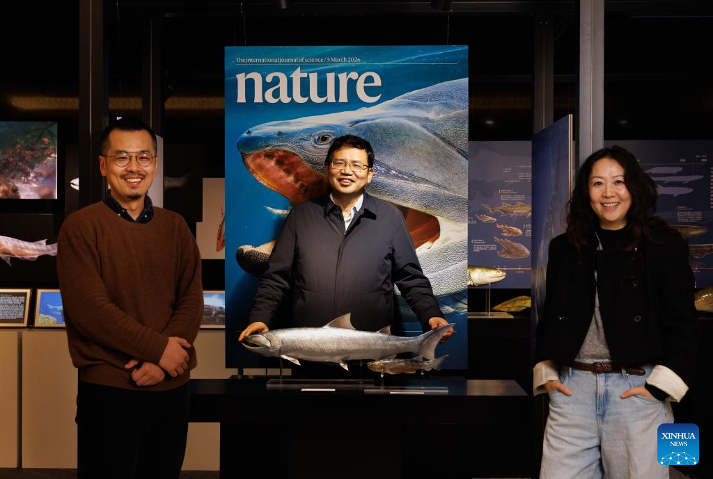 Academician Zhu Min (C), together with Researchers Lu Jing (R) and Zhu You'an, poses for a photo at the Institute of Vertebrate Paleontology and Paleoanthropology (IVPP) of the Chinese Academy of Sciences (CAS), in Beijing, capital of China, March 3, 2026. Fossils of two fish from over 400 million years ago -- one a tiny streamlined creature, the other a giant among vertebrates of its time with bizarre teeth -- have been discovered in China, filling a critical gap in the evolutionary journey "from fish to human." (Xinhua/Jin Liwang)