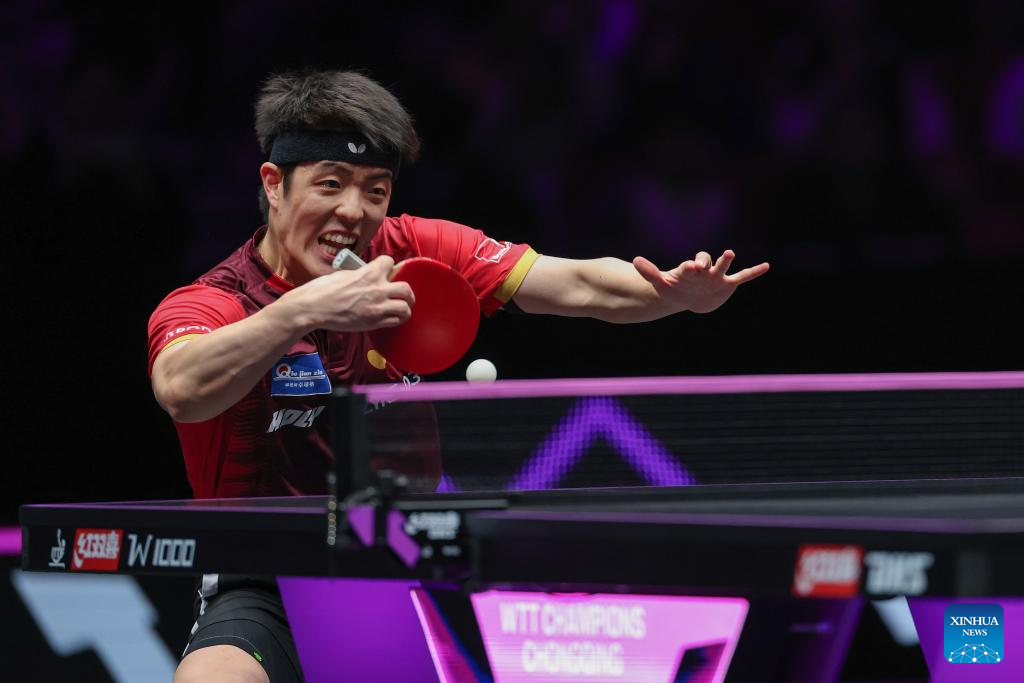 Wen Ruibo (L) of China and Qiu Dang of Germany compete during the men's singles quarterfinal match at the WTT Champions Chongqing 2026 in southwest China's Chongqing, March 14, 2026. (Xinhua/Chen Cheng)