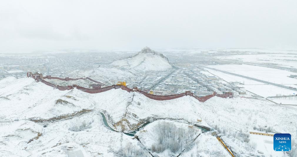 This aerial photo taken on March 13, 2026 shows the snow scenery of ancient white castles on Mt. Dzongri in Gyantse, Xigaze City, southwest China's Xizang Autonomous Region. (Xinhua/Jigme Dorje)