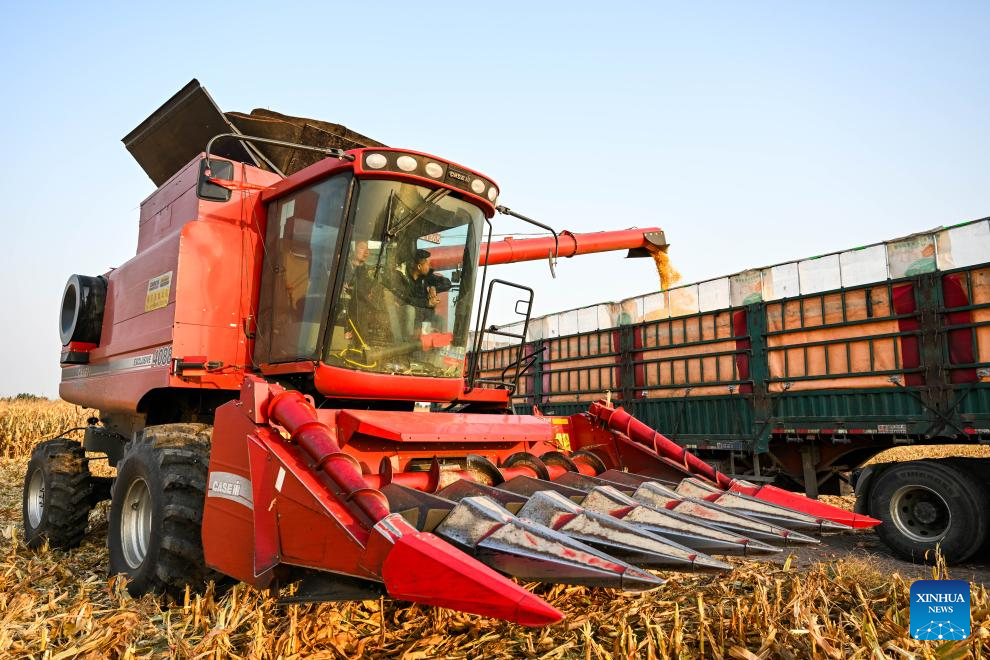 A harvester unloads corns in Horqin District of Tongliao City, north China's Inner Mongolia Autonomous Region, Oct. 14, 2025. (Xinhua/Lian Zhen)