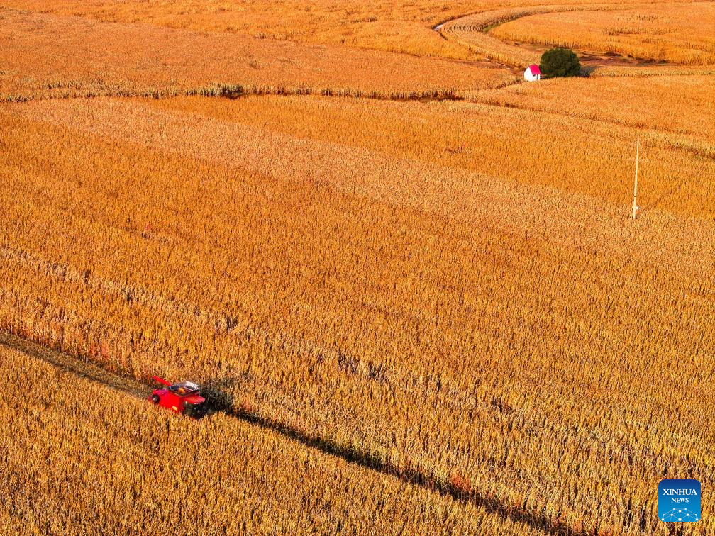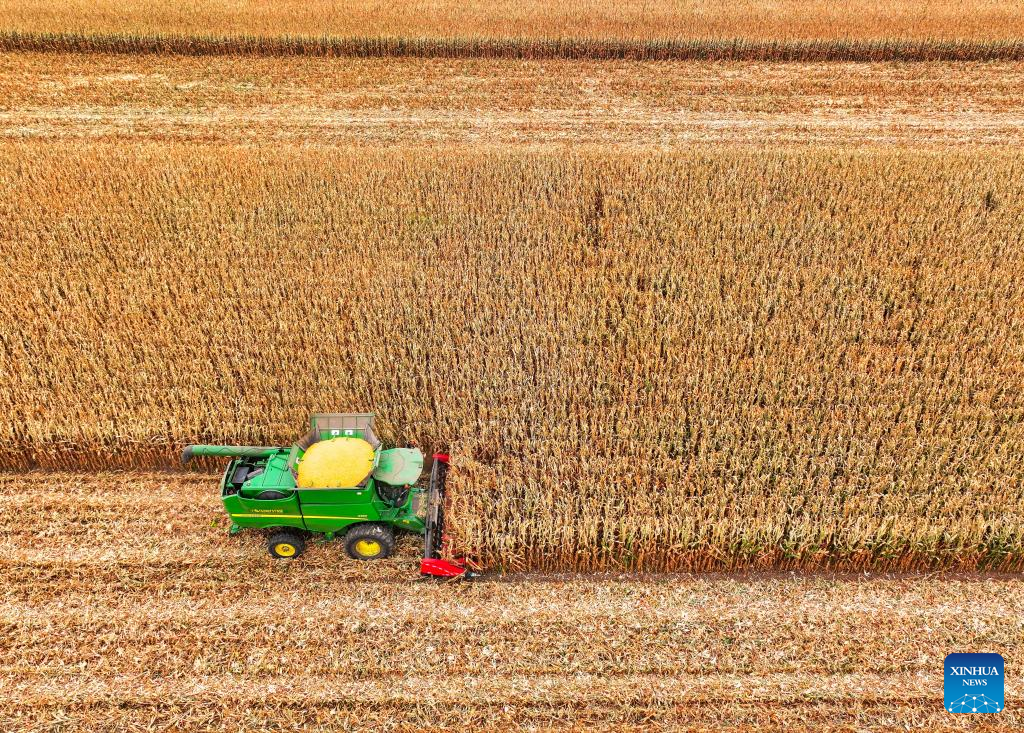 An aerial drone photo shows a harvester working in a corn field in Horqin District of Tongliao City, north China's Inner Mongolia Autonomous Region, Oct. 14, 2025. (Xinhua/Lian Zhen)