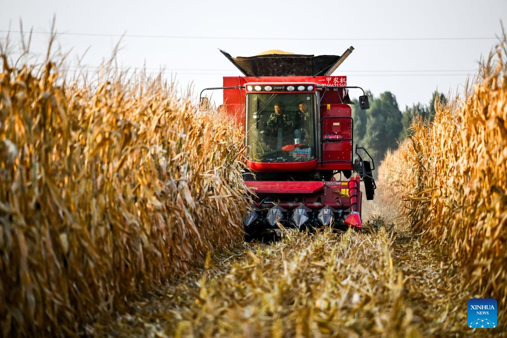 A harvester works in a corn field in Horqin District of Tongliao City, north China's Inner Mongolia Autonomous Region, Oct. 14, 2025. (Xinhua/Lian Zhen)